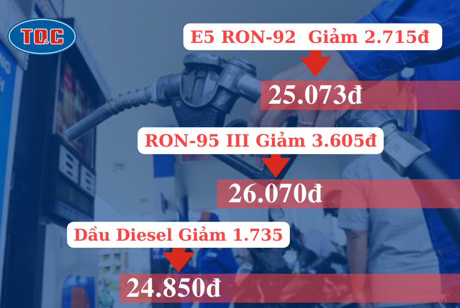 Sau điều chỉnh của liên Bộ Công Thương - Tài chính, giá bán lẻ xăng E5 RON 92 còn 25.073 đồng/lít (giảm 2.715 đồng); còn xăng RON 95 là 26.070 đồng/lít (giảm 3.605 đồng).