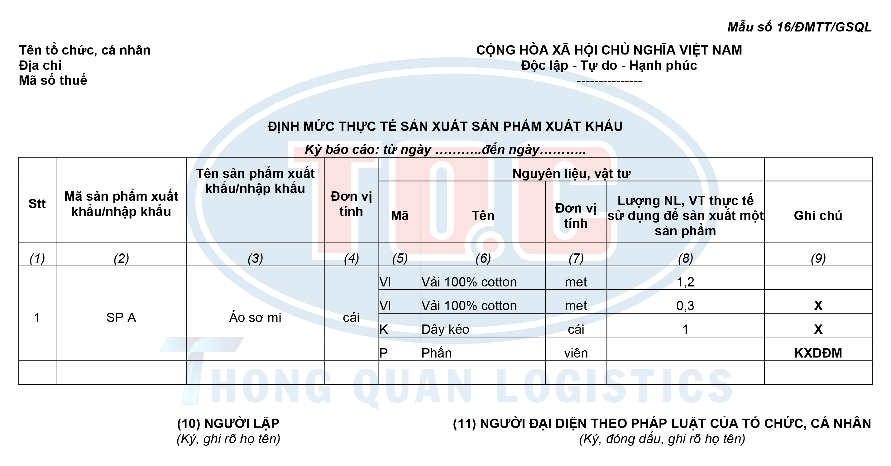 Cột (9): Trường hợp nguyên liệu mua trong nước điền "X"; trường hợp nguyên liệu, vật tư nhập khẩu để trống; trường hợp vật tư không xây dựng được định mức điền "KXDĐM"
