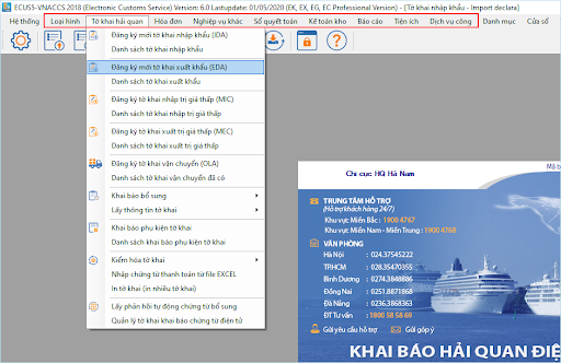 - Bước 1: Khai thông tin xuất khẩu (EDA). Người khai sẽ phải khai các thông tin xuất khẩu cần thiết bằng nghiệp vụ EDA trước khi tiến hành đăng ký tờ khai xuất khẩu. Sau khi hệ thống đã nhận và cấp số thì thông tin bản khai xuất khẩu EDA sẽ được lưu trữ trên hệ thống VNACCS.