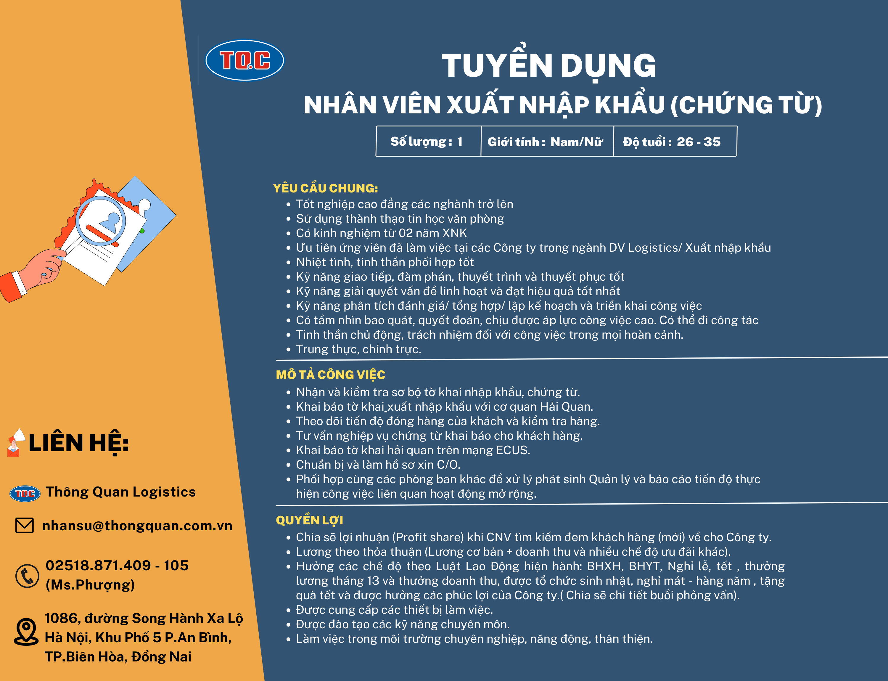Công ty Cổ Phần Thông Quan - Thông Quan Logistics xin thông báo tuyển dụng: